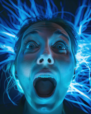 Portrait of a woman with open mouth and blue light emanating from her head, conveying emotion and thoughtfulness