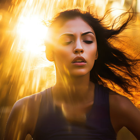 Woman with flowing hair enjoys sunlight, her face illuminated with warm glow. soft breeze adds sense of freedom and joy to moment, capturing serene expression
