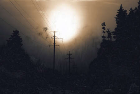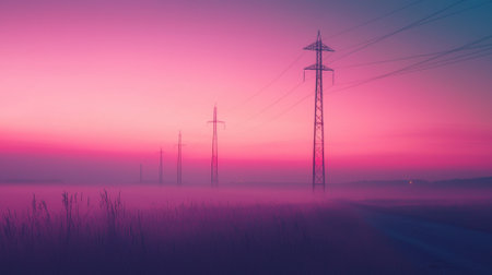A beautiful sunset casts an orange glow over a landscape filled with power lines. The mist creates a serene atmosphere, reflecting the balance between energy and nature.