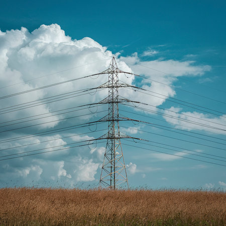 high voltage pylon with blue sky and white clouds