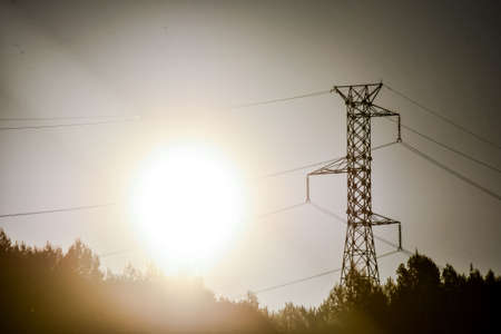 Electricity poles and landscape in the evening at sunset