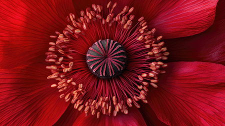 Stunning close-up image of a vibrant red flower capturing intricate details of its center, showcasing the beauty and texture of nature. Perfect for floral designs.