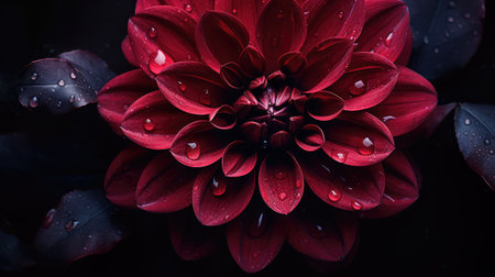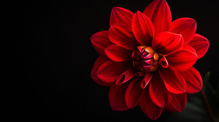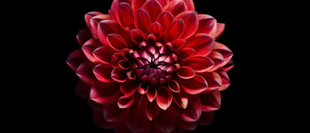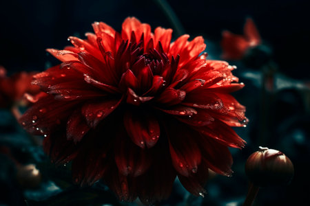 Red dahlia in bloom on dark background, close-up of petals in dramatic lighting. Floral beauty and elegance concept