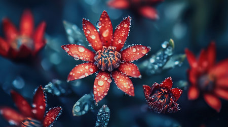 A captivating close-up shot showcasing vibrant red flowers adorned with glistening water droplets, highlighting the beauty of nature.