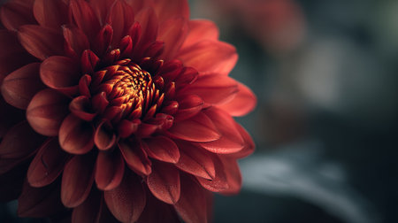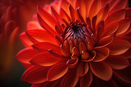 Close-up of vibrant red dahlia flower with intricate petals and soft lighting, detailed nature study and floral beauty concept