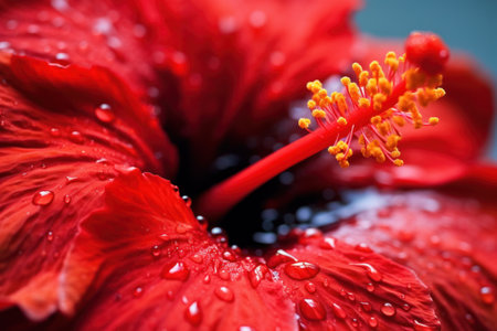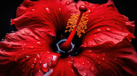 Close up of red hibiscus flower with water drops. Generative AI.