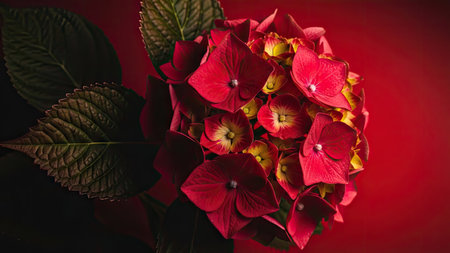 Red hydrangea flowers on a dark red background with copy space