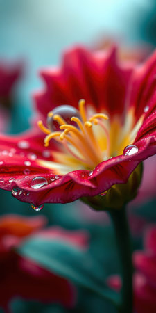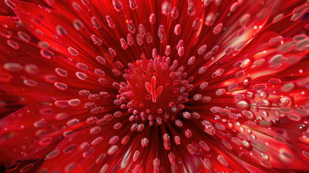 Close-up of a vibrant red flower with dew drops on its petals. The image showcases the intricate details of the flower.