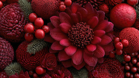 Vibrant red floral arrangement with textured blooms and lush botanical elements.