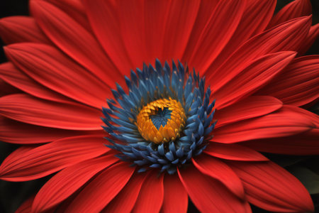 Red flower with yellow center and blue petals on black background. generative ai