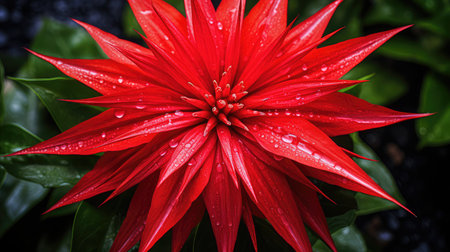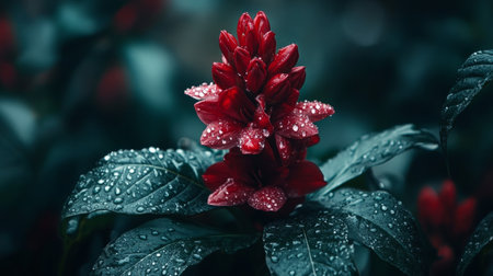 Delicate red ginger flower with water drops on its glossy petals, surrounded by lush green leaves, tropical aesthetic generative ai