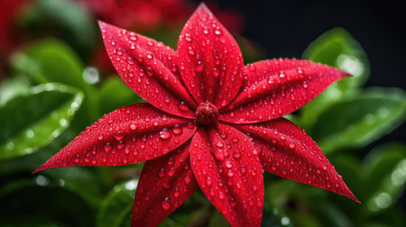 Vibrant red flower glistens with raindrops in a lush garden during early morning light