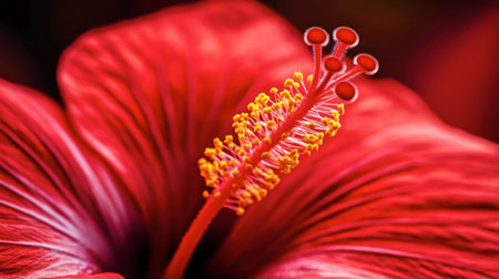 A macro shot of a hibiscus flower, showcasing its intricate stamen and bright red petals.