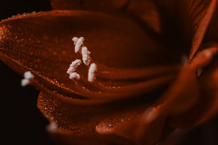 Red hippeastrum on a black background. Womens health concept. Scarlet flower of love. Macro close-up photo of drops on the petals. A reference to tenderness, care and kindness.