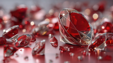 A stunning collection of sparkling red gemstones scattered elegantly across a reflective surface, creating a luxurious backdrop for various design projects.