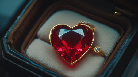 A stunning heart-shaped red gemstone ring elegantly displayed in a luxurious velvet jewelry box, perfect for romantic gestures and special occasions.