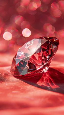 Large diamond on a reflective red surface with sparkling bokeh