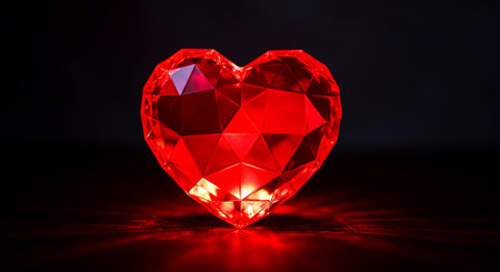 Illuminated red crystal heart sculpture with intricate facets, reflecting light in a dark setting, symbolizing love and passion, creating a dramatic ambiance, AI generated