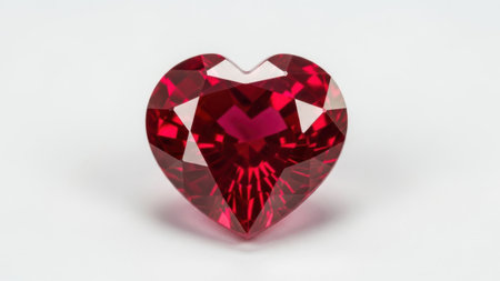 This image features a stunning red gemstone meticulously cut into the shape of a heart. The gemstone exhibits a rich, deep red hue and is set against a plain white background, which accentuates its vibrant color and intricate facets. The heart shape symbolizes love and affection, making it an ideal piece for jewelry or a sentimental gift. The gemstone's facets catch the light, creating a mesmerizing sparkle that adds to its allure.