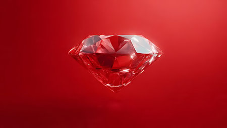 Vibrant red background with a floating glass diamond. Close-up of Detail with gem refraction.