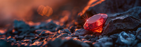 Dazzling Red Gemstone on Dark Rocks at Sunset with Sparkling Light.