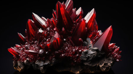 Vivid red crystals with sharp edges resting on a reflective surface create a stunning visual against a dark background, perfect for artistic and scientific themes.
