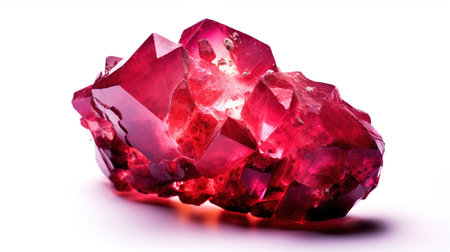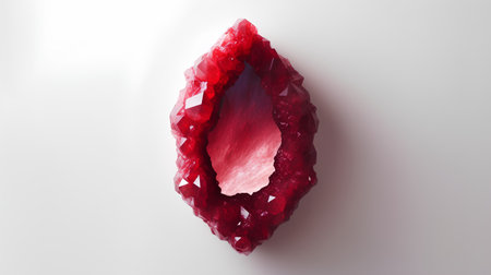 a ruby red gemstone, reminiscent of the styles of nathan wirth, hinchel or, and suguru tanaka, is showcased on a pristine white backdrop. the gemstone exhibits color-streaked patterns in light red and light emerald, exuding an extravagant aura. crafted with precious materials, this piece captivates with its unique beauty and artistic finesse. ai generated