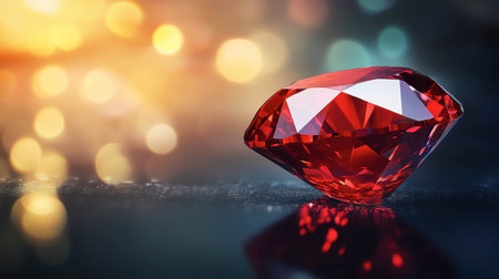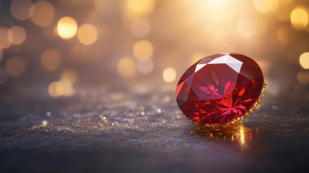 A stunning red gemstone with intricate facets rests on a shimmering surface, surrounded by a dreamy golden bokeh, creating a luxurious and elegant atmosphere.