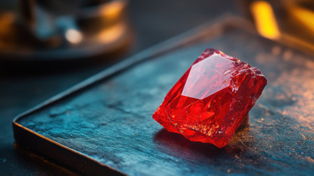 This stunning red gemstone captures light beautifully, resting upon a glittery blue surface. The vibrant colors and elegant design create an exquisite visual impact.