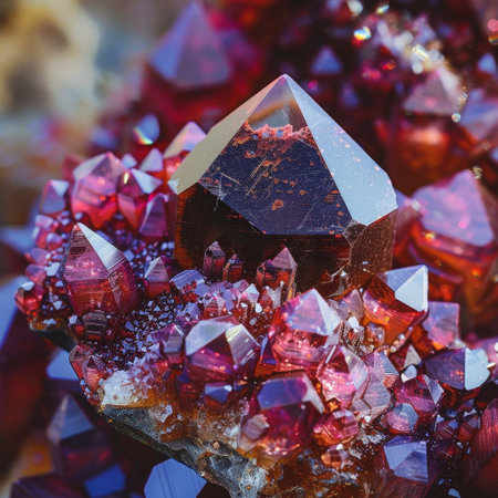 Glistening ruby crystals showcasing brilliant red hues and intricate textures