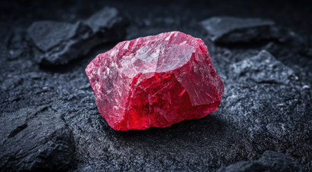 Vibrant red ruby crystal on dark rocks
