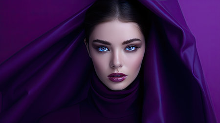 Glamorous young woman in a stylish purple dress against a glossy violet backdrop exuding charm and elegance at a celebration event