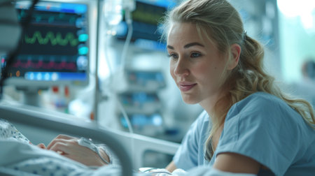 Female healthcare professional monitoring medical equipment, analyzing patient data in hospital setting. Concept of dedicated medical care, technology in healthcare, vital signs monitoring
