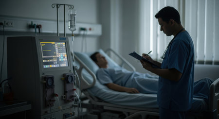 The image depicts a doctor, dressed in scrubs, standing by a patient's bedside in a hospital room. The doctor is holding a tablet and appears to be reviewing the patient's vital signs displayed on a medical monitor. The patient is lying in a hospital bed connected to various medical equipment, including an IV drip and monitoring devices. The room is well-lit with natural light coming through the window, creating a calm and professional atmosphere.