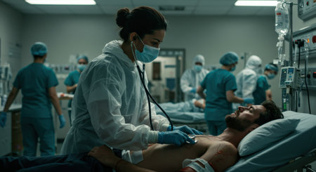 A medical team in protective gear provides urgent care to a critically ill patient in a hospital setting, illustrating the intensity and dedication of healthcare professionals during emergencies.