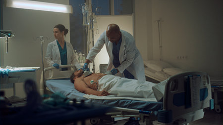 Doctors and nurses in ICU with patient in intensive care unit.