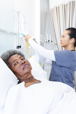 Diverse female doctor preparing drip and senior female patient lying in bed in sunny hospital room. Medicine, healthcare and medical services, unaltered.