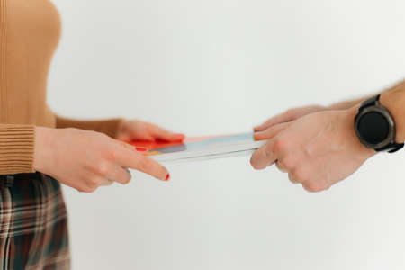 Technological toys. Closeup cropped image of people holding a smartphone and a digital tablet.
