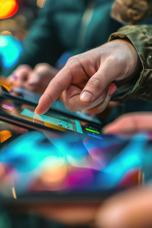 Tablet screen glowing as a hand swipes through a catalog of visuals, symbolizing modern digital interactions