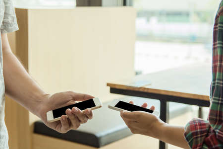 Close up of men and woman hands holding touching mobile phone with blank copy space for your text message in cafe with light Sunset,Vintage tone.Selective focus
