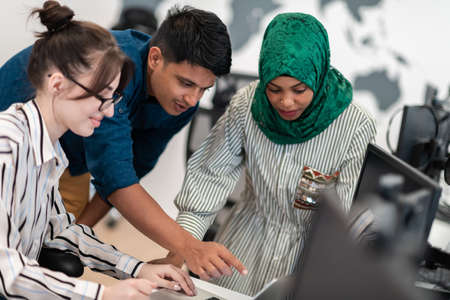 Multiethnic startup business team Arabian woman wearing a hijab on meeting in modern open plan office interior brainstorming, working on laptop and desktop computer. Selective focus