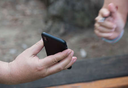 Top view of a man holding a smartphone in hands while talking with a woman showing her something. Focus on phone