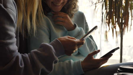 happy young women in stylish hoodies enjoy social media with mobile phones sitting near tropical plant on windowsill in cozy cafe