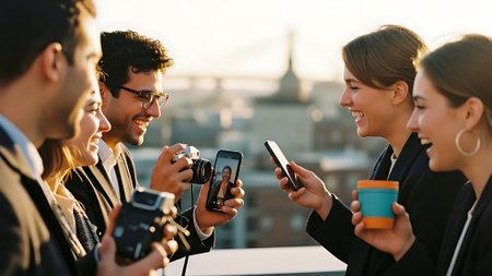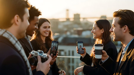 Group of young multiethnic people taking photos with digital camera and drinking coffee outdoors