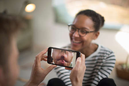 Group of happy young people taking photos with mobile phones and drinking coffee