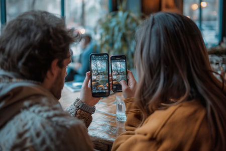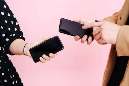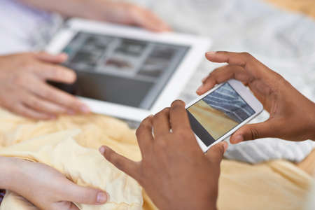 Close up of people using mobile smart phones - Detail of friends sharing photos on social media network with smartphone - Technology concept and cellphone culture with selective focus on right hand