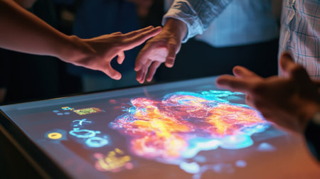 A medium closeup of a collaboration session between trainees and instructors with an instructor gesturing toward a 3D holographic representation of a surgical procedure in midair. Io
