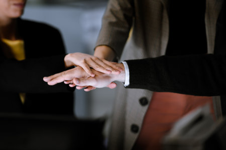 Team of work of creative designers showing unity with their hand together during meeting. Business and team work concept.