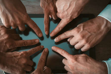 Business people showing on screen together. Human hands touching by fingers on digital tablet or laptop empty screen together in office. Tinted image.