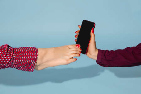 Unblocking phone. Bright fashionable hand and leg working up daily things together. Modern artwork, contemporary art. Trendy colors, magazine style. Usual routine in unusual way. Blue background.
